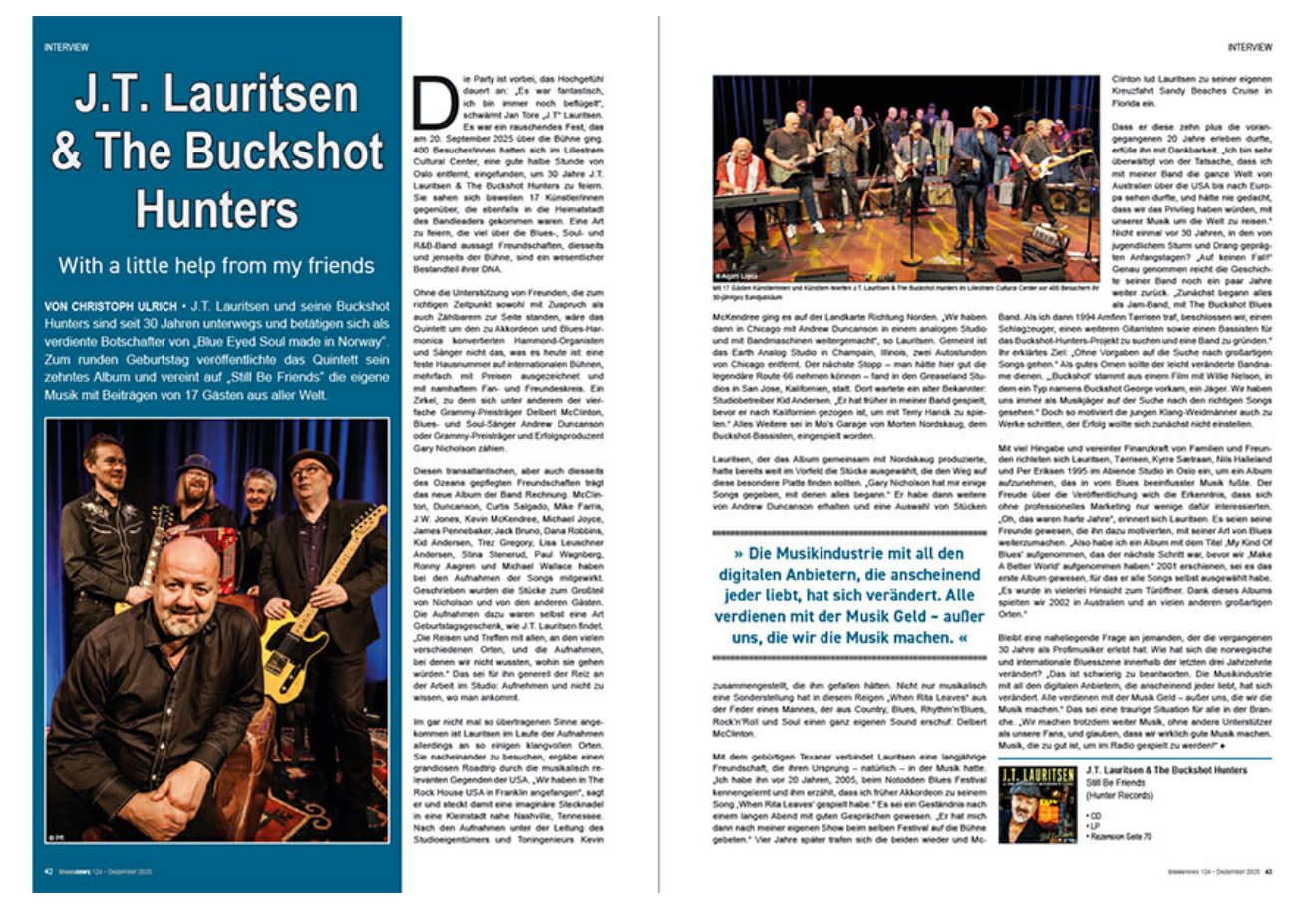 The party is over, but the euphoria lingers. “It was fantastic—I’m still flying,” enthuses Jan Tore Lauritsen. It was a rousing celebration that took place on September 20, 2025, in Lillestrøm. Four hundred guests gathered at the Lillestrøm Cultural Center, about half an hour from Oslo, to celebrate 30 years of J.T. Lauritsen & The Buckshot Hunters. At times, they found themselves facing as many as 17 artists who had also traveled to the bandleader’s hometown to celebrate. It was a kind of celebration that says a lot about this blues, soul, and R&B band: friendships, on and off the stage, are a core part of their DNA.